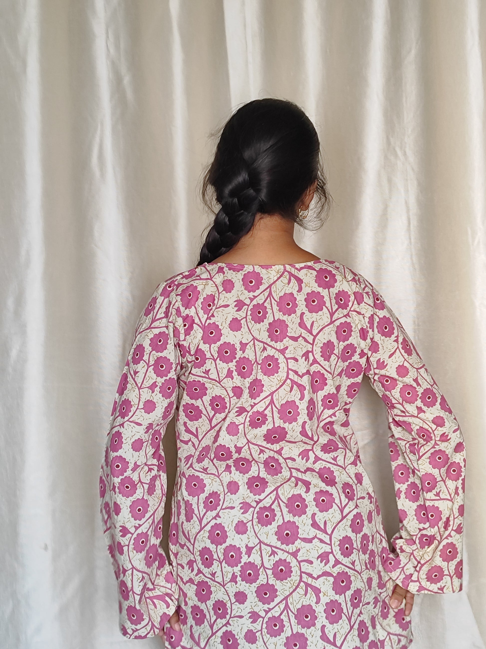 Designed with a stylish 3-point neckline and flowy bell sleeves, this short kurti brings a chic, trendy, and comfortable everyday look. Perfect for college, casual outings, or daily wear — pair it with jeans, palazzos, or straight pants for a graceful yet effortless fit.