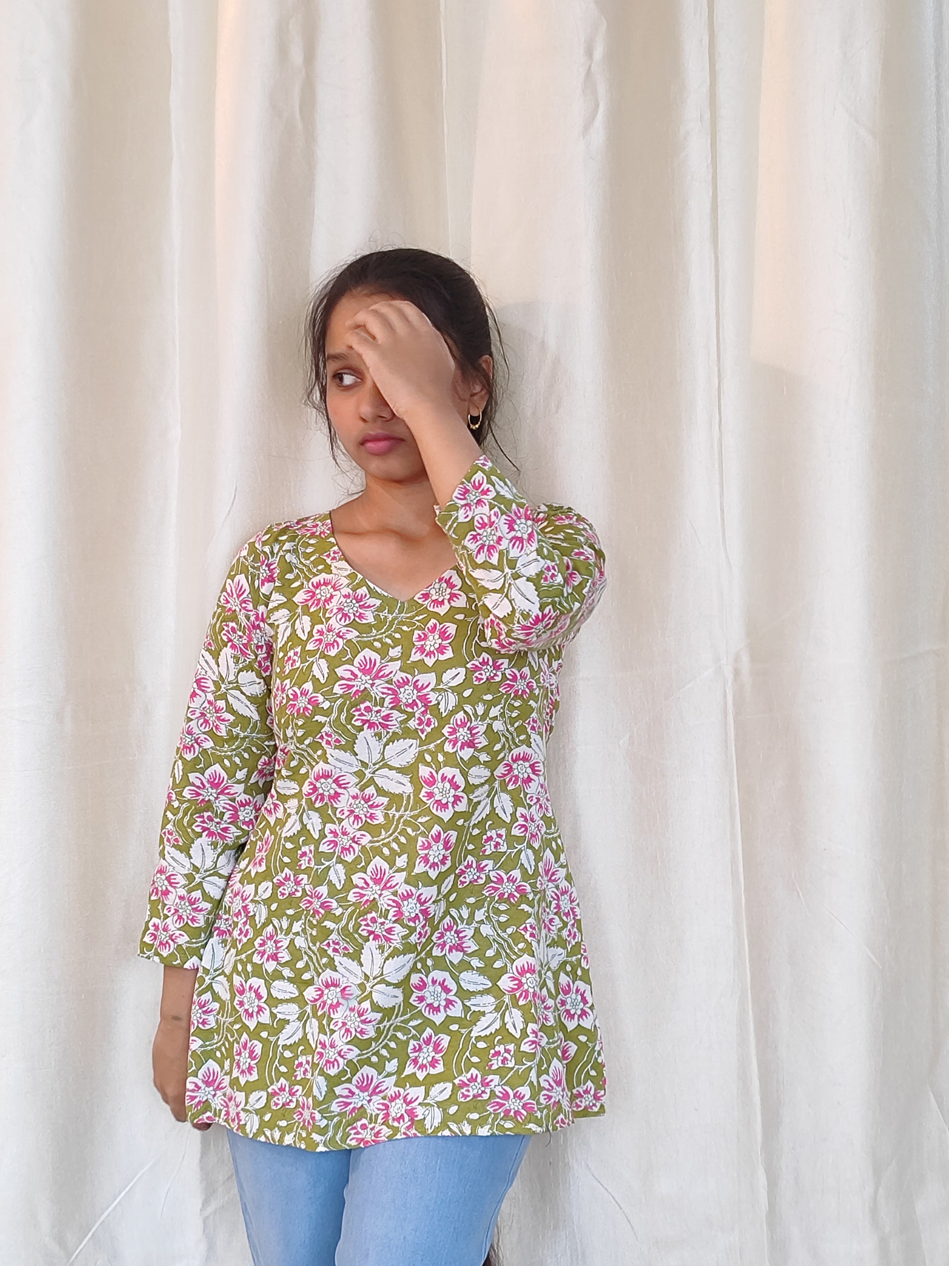 This cotton short kurti features a V-neckline and 3/4th sleeves, combining feminine charm with everyday comfort. Perfect for casual outings or festive occasions — pair it with pants, leggings, or palazzos for a chic, effortless look.