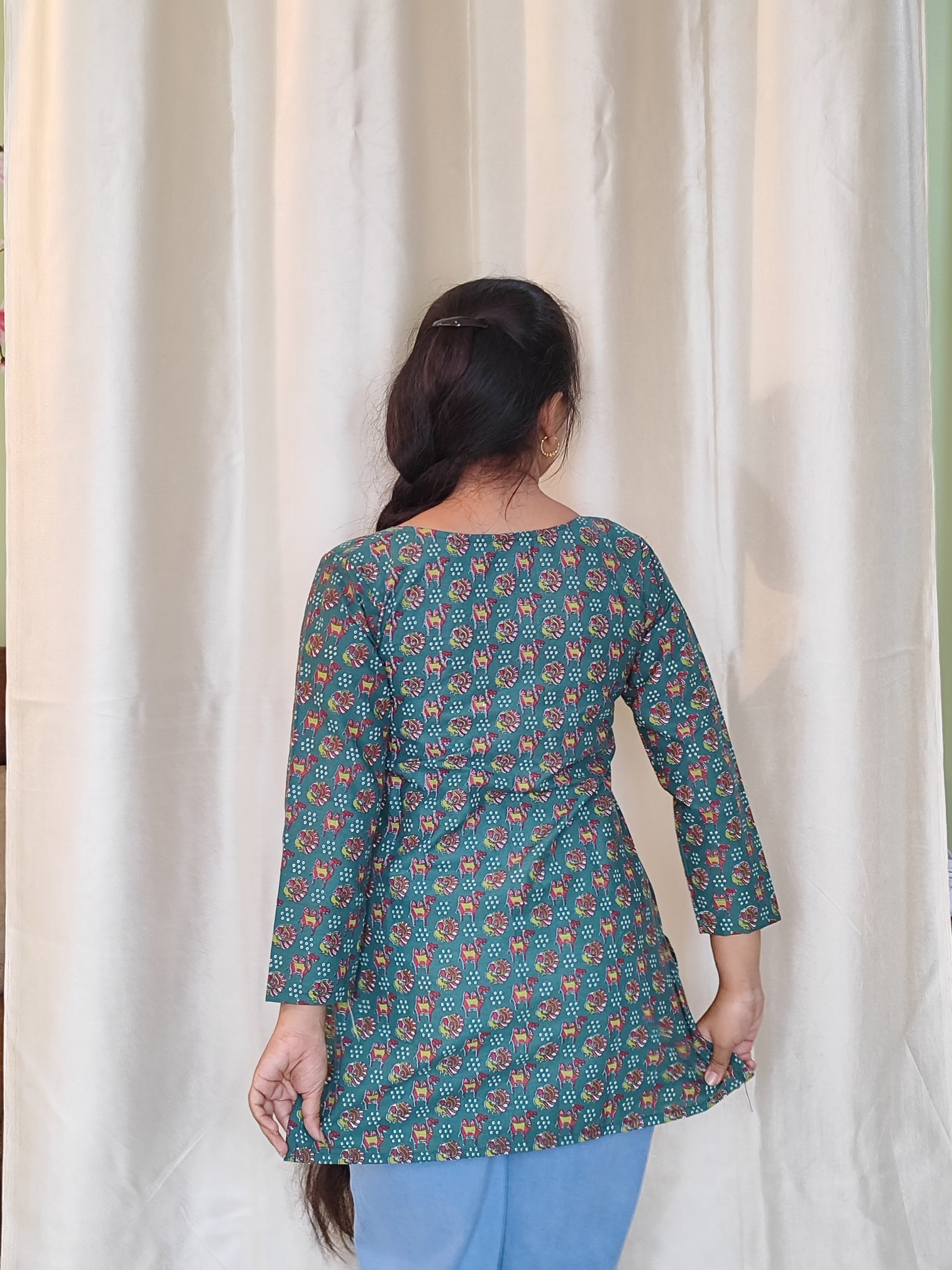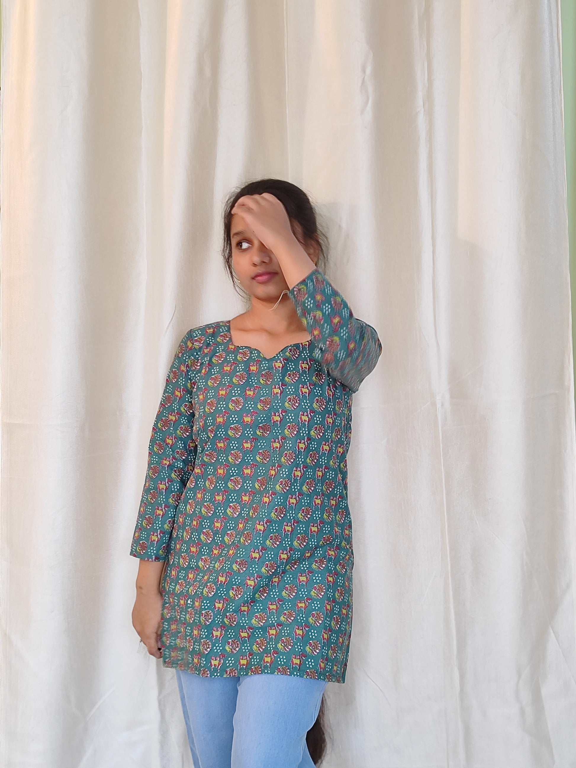 This cotton short kurti features a sweetheart neckline and 3/4th sleeves, combining feminine charm with everyday comfort. Perfect for casual outings or festive occasions — pair it with pants, leggings, or palazzos for a chic, effortless look.