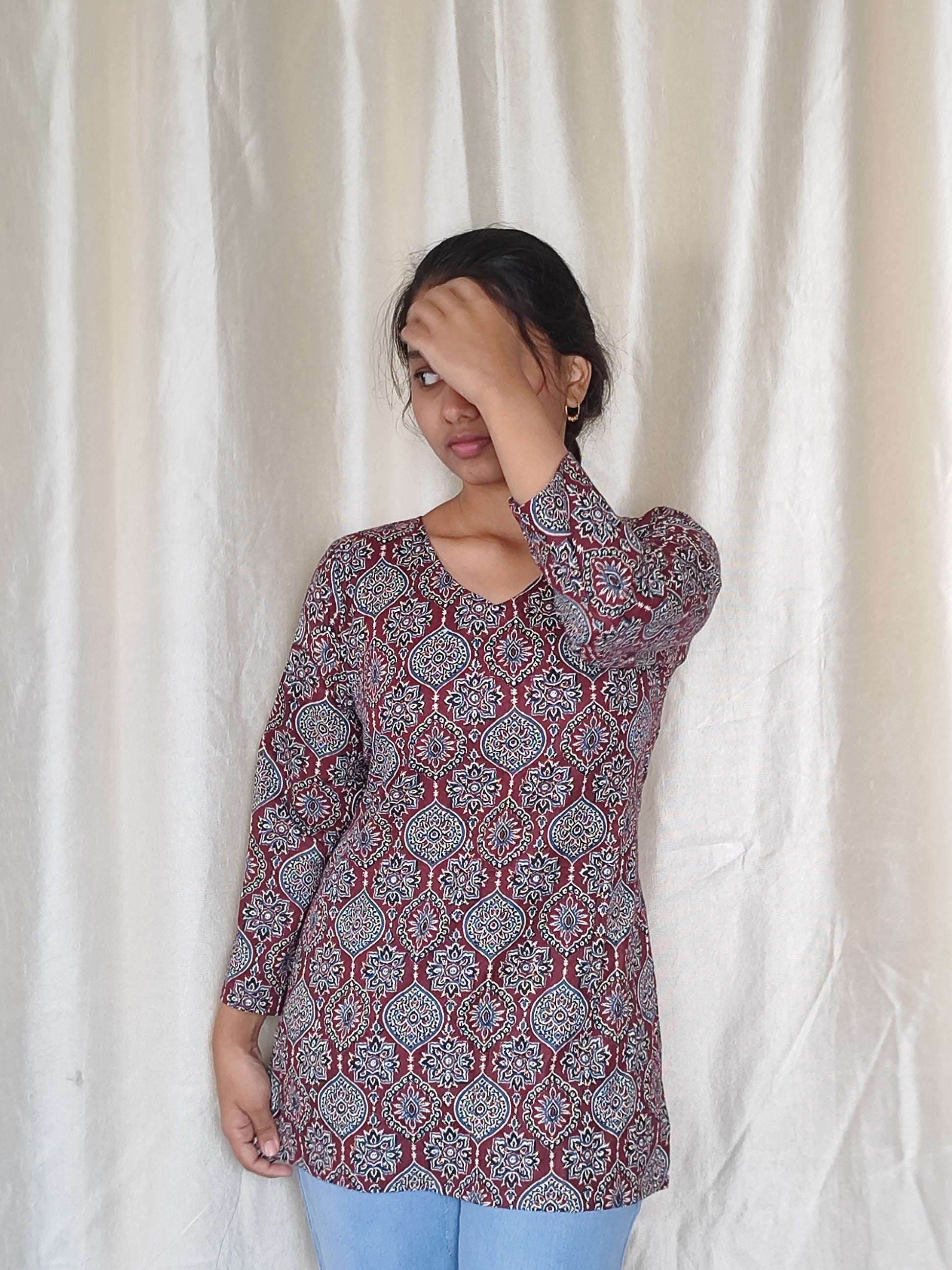 Designed with a classic V-neckline, comfortable 3/4th sleeves, and a corset back that helps achieve the perfect cinched waist, this short kurti offers a neat, flattering, and everyday-ready look. Perfect for college, office, casual outings, or daily wear — pair it with jeans, leggings, or straight pants for a smart, effortless fit.